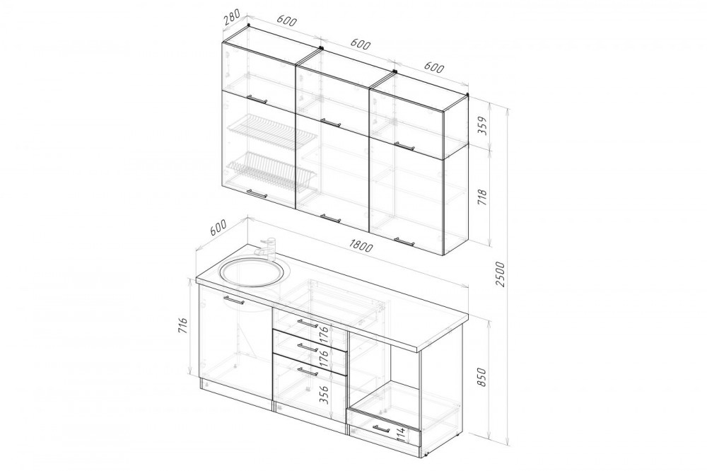 Ширина: 1800 мм; Глубина: 600 мм (со столешницей)